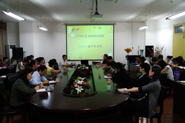 池教授首先给大家介绍了社会史研究的内容,包括社会生活、社会结构、社会职能和社会问题等方面。接着,池教授还讲到,中国社会史的学科体系就是把社会看成一个整体,而社会体系又可分为四大系统:社会生活、社会结构、社会职能及调节控制系统。然而,一门学科总是随着时代的发展和学者的探索而不断得到拓展,这是学科发展史意义上的“与时俱进”,社会史学科也是如此。首先,所谓从社会学理论到中国社会实践,就是要运用社会学的理论与方法来认识中国社会、改造中国社会,解决中国的社会问题。其次,社会学的中国化必须以中国的历史社会和现实社会之间的联系与区别来说明这个关系问题。而离开中国社会史的研究,就根本不可能说明这一点。最后,从社会学中国化的具体内容来看,富有中国特色的社会学必须反映中国社会的特点。中国社会的特点不是凭空产生的,而是在中国社会长期的历史发展过程中形成的。所以,我们学习中国社会史,重点研究中国社会历史发展的特殊性,注重于同西欧或其他各国历史的横向比较。池教授还指出,我们若把中国社会史的特点搞清楚了,那么对于现实中国社会的特点就比较容易得到一个清醒的认识,这对于社会学中国化无疑具有重大意义。