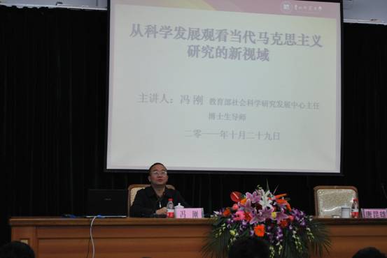 冯刚在讲座中指出,科学发展观首先奠基于科学的哲学基础和理论基石,唯物辩证法的普遍联系和永恒发展在理论上规定科学发展观既要注重整体性,坚持全面协调可持续发展;又要注重科学性,做到在发展中动态地把握“发展是第一要义”的内涵。其次,科学发展观是在全球视野和人类发展框架中审视中国发展的,既坚持了中国特色的社会主义,又吸收了西方国家的发展成果;科学发展观注意吸收人类历史上关于人的发展的理念,凸现人的社会契约、社会道德和社会责任的构建。最后,科学发展观实现了多样的价值选择和价值建构,提出当前的发展要形成经济价值、社会价值、文化价值和生态价值的统一,准确把握发展的人文价值,实现人的全面发展。